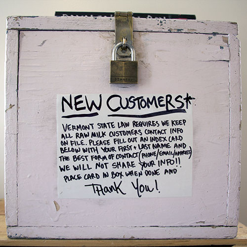 | Aubrey: "We have raw milk available year-round. We are a 100% grass-fed cow raw milk dairy. Our farmstand is open year-round / 7 days a week (7am-7pm) for people to stop in at any point. We ask customers to call or email ahead if they are looking to purchase more than 3 gallons of milk so that we can reserve it for them. We we're Vermont's 1st certified raw milk dairy and take great pride in producing the healthiest, cleanest, and most delicious raw milk possible, while raising and taking care of healthy, vibrant 100% grass-fed cows." | ||||
